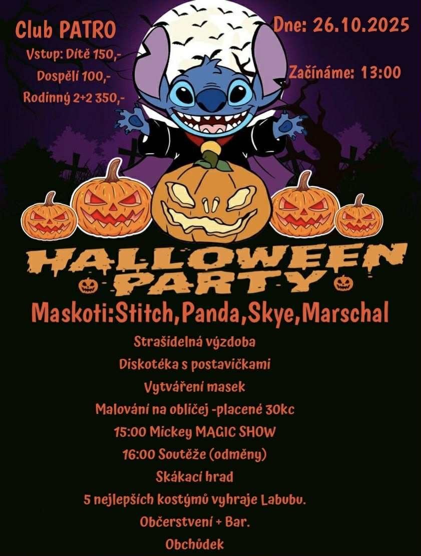Dětská Halloween party s roztomilými maskoty, soutežemi a kouzelníkem. Přijďte si zatančit se Stitchem, Sky, Marschallem nebo Pandou. Pokud vás nebaví tanec, bude k dispozici skákací hrad, nebo malování na obličej.